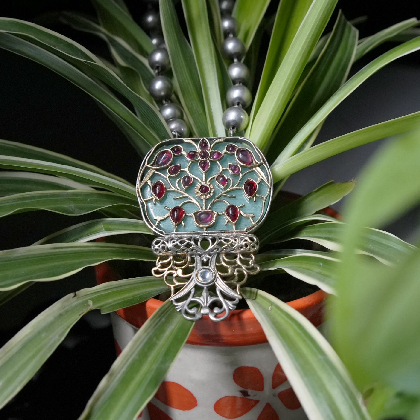 Make a bold ethnic statement with the Revaaj Oxidised Silver Replica Necklace Set, featuring intricate inlay work in rich maroon and green tones. The handcrafted pendant, paired with matching earrings, showcases traditional Indian artistry with detailed floral patterns and oxidised silver finish, exuding vintage charm. Strung on metallic silver beads, the necklace brings a heritage feel with a modern twist — ideal for casual ethnic wear, festive functions, and Indo-western styling