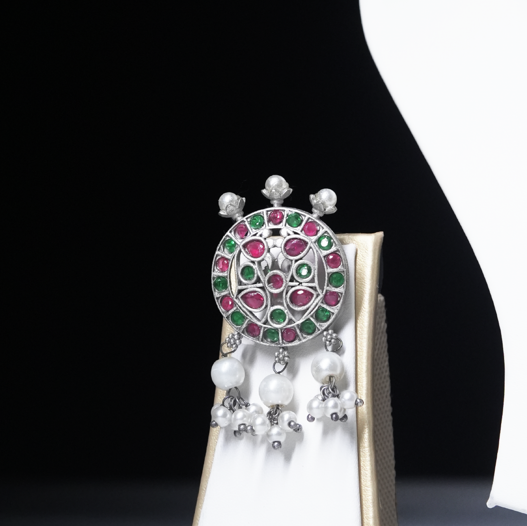 Make a bold statement with our Vintage Oxidized Silver Choker Necklace Set, featuring a stunning silver-tone replica design inspired by traditional Indian jewelry. Adorned with intricate floral patterns accented in green and pink enamel work, this choker is beautifully enhanced with cascading pearl beads for a royal touch. Paired with matching earrings, it’s perfect for festive occasions, ethnic parties, or as a striking accessory with sarees, lehengas, and fusion outfits. Elevate your style with this handcrafted oxidized jewelry set, a timeless piece that exudes elegance and heritage charm.