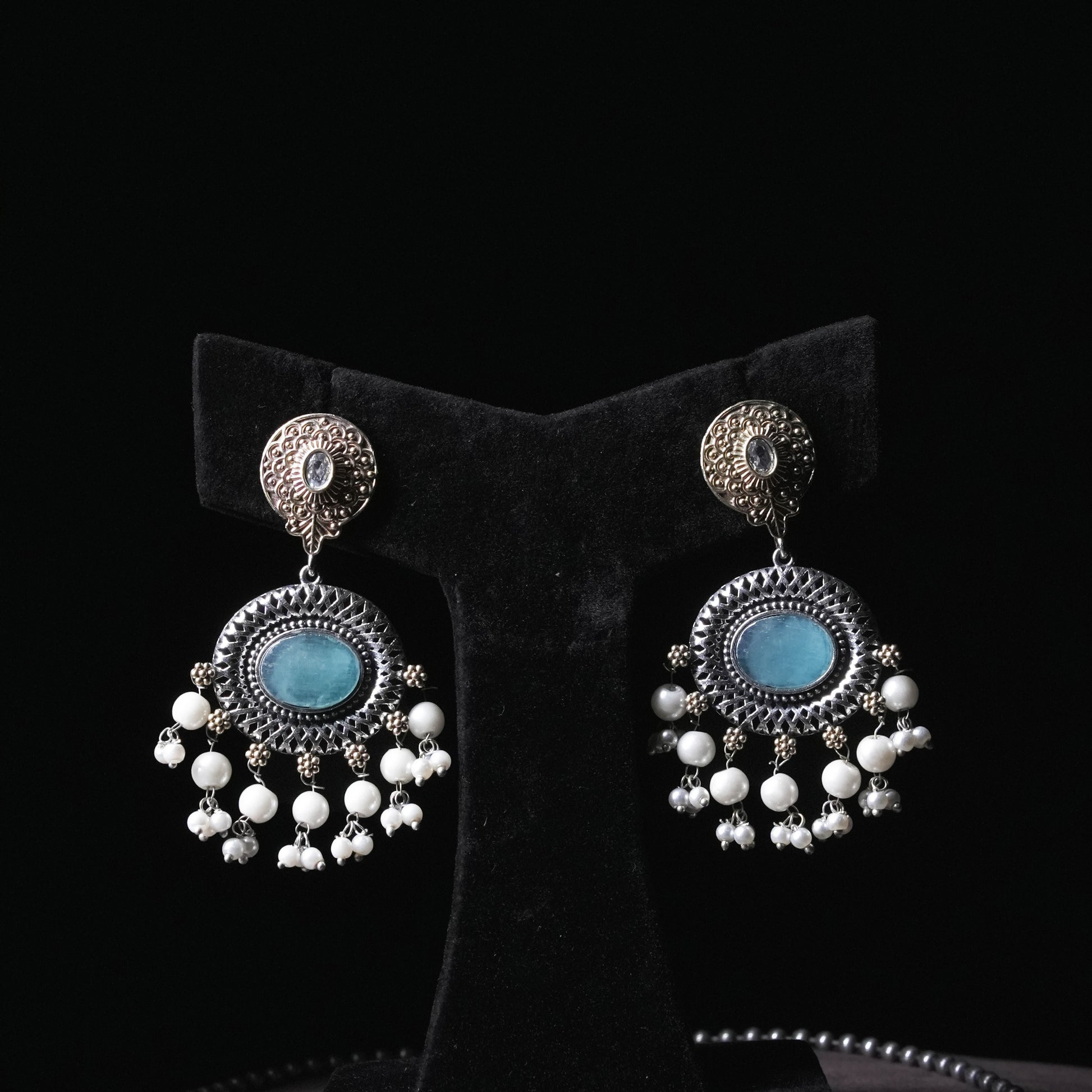 Vintage Oxidized Silver Necklace Set with Mint Green Stone & Pearl Drops